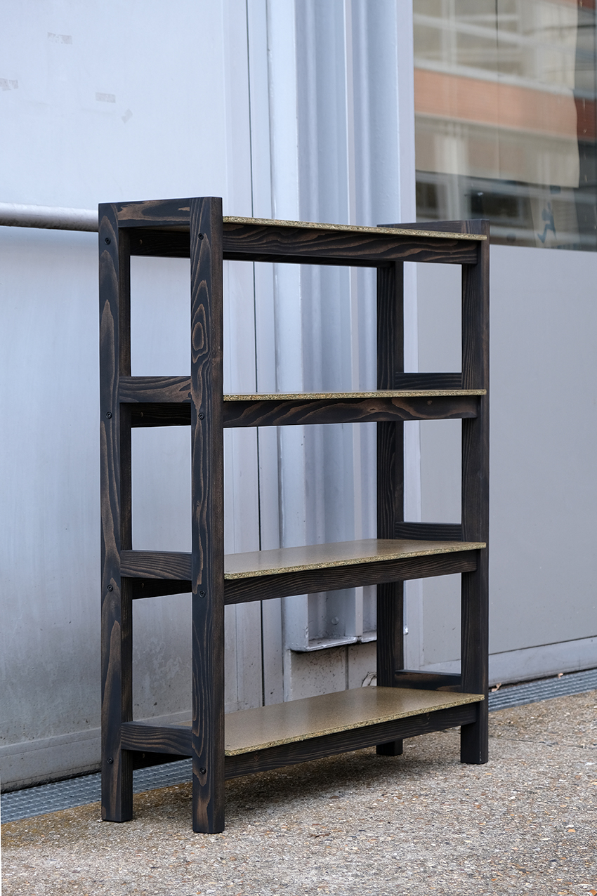 PM est une série de meubles composés d’une structure en bois massif et de tablettes en panneaux. Les côtés des meubles sont reliés par des traverses. Assemblés par des vis, ils sont démontables.