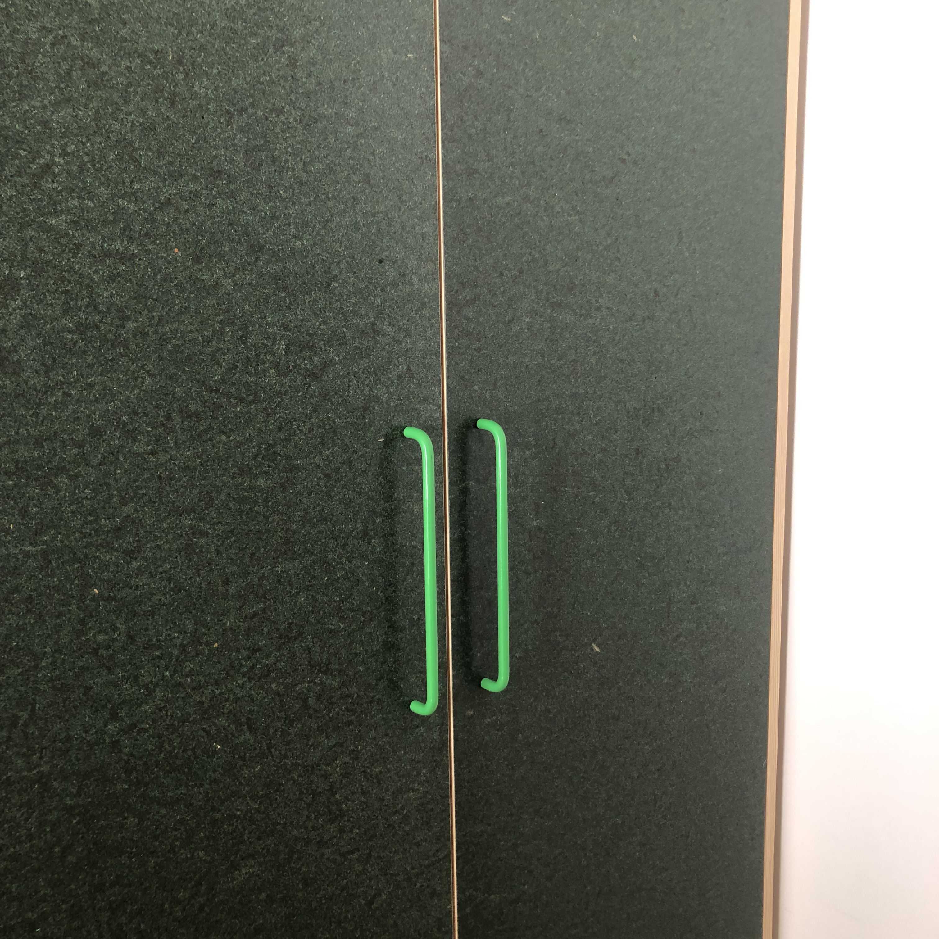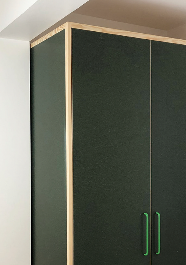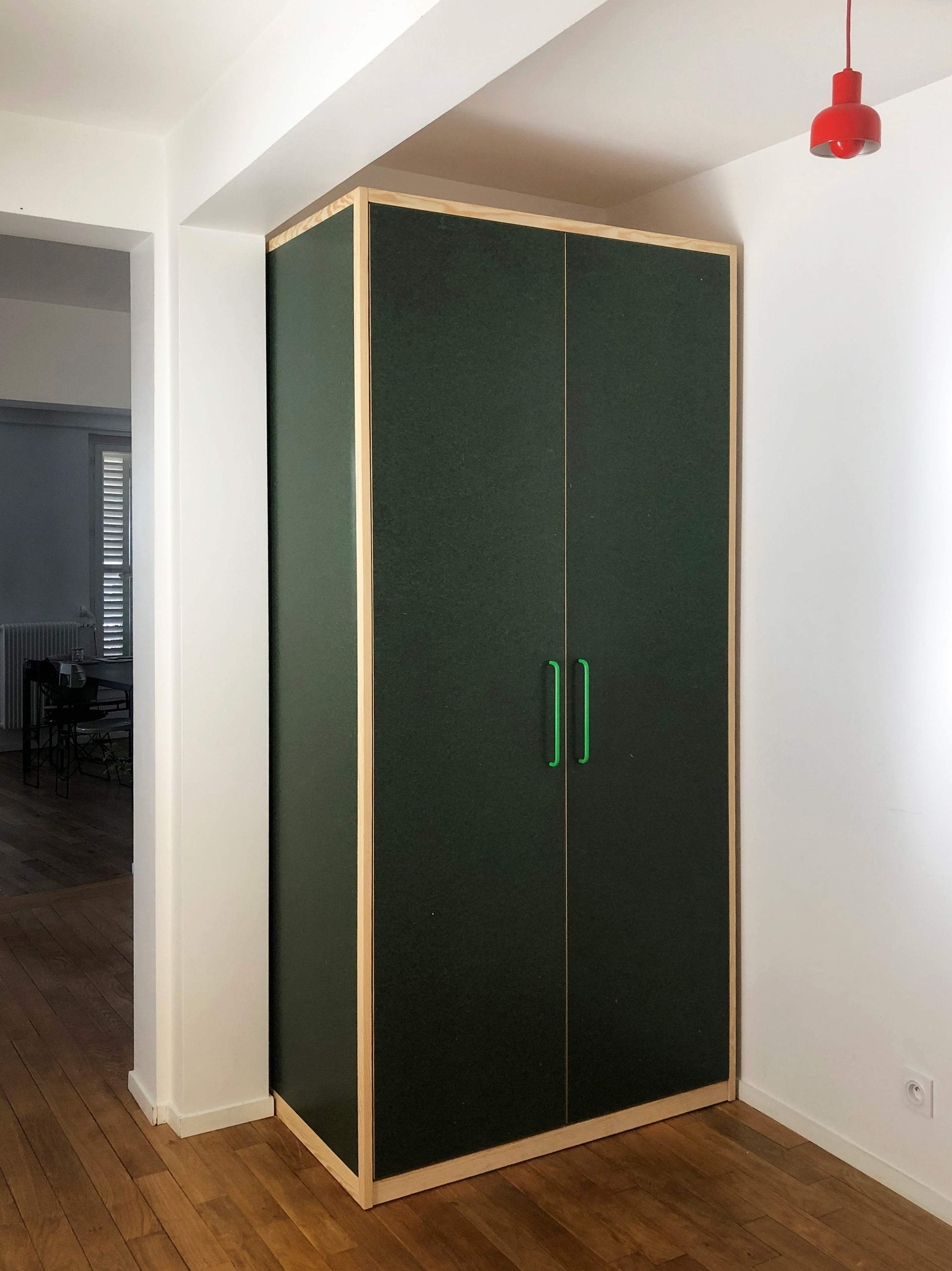 Armoire à deux portes pour une entrée. L'intérieur est constitué d'une penderie et de tablettes réglables.