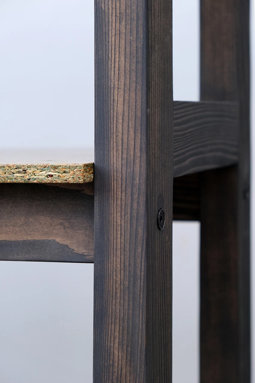 PM est une série de meubles composés d’une structure en bois massif et de tablettes en panneaux. Les côtés des meubles sont reliés par des traverses. Assemblés par des vis, ils sont démontables.