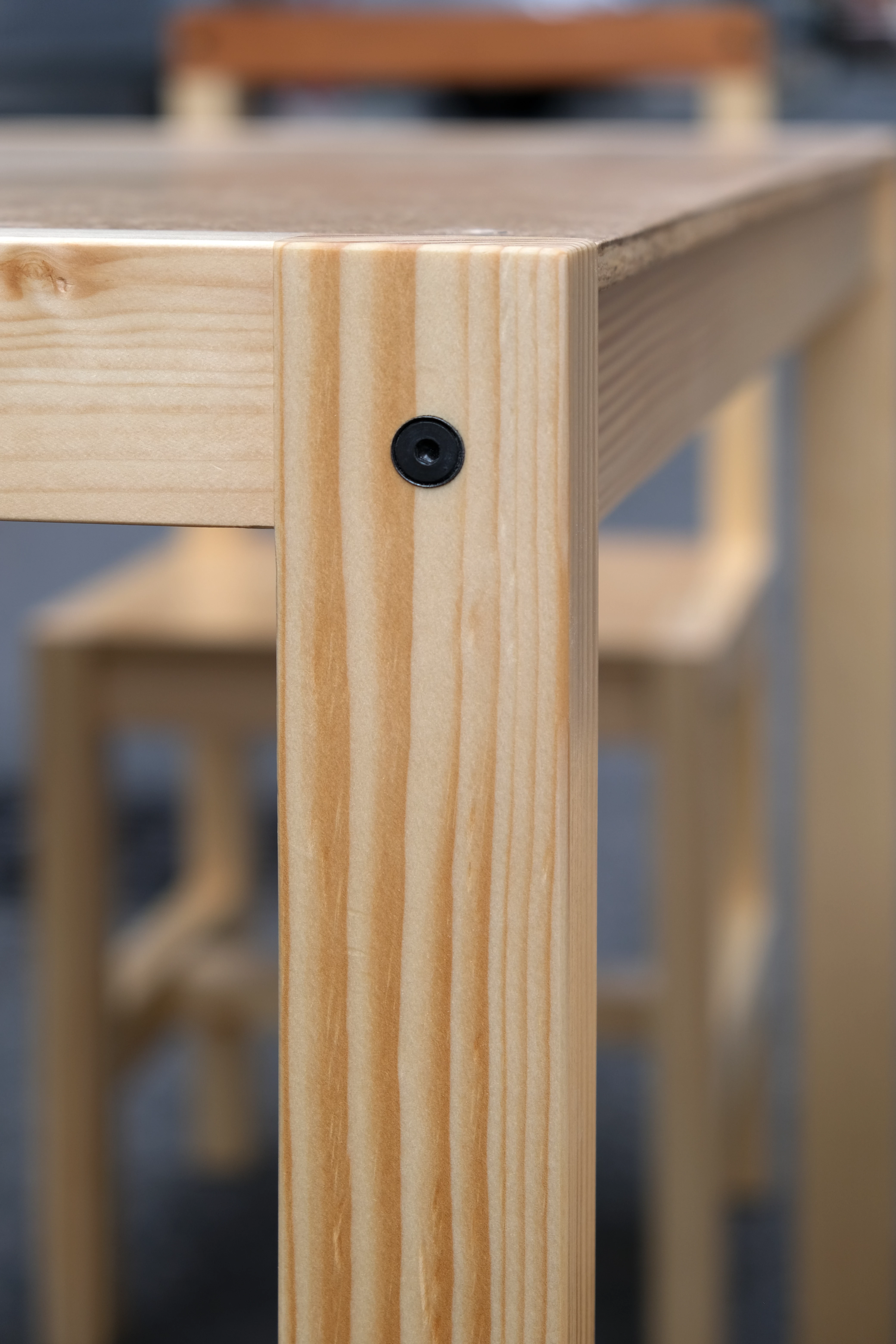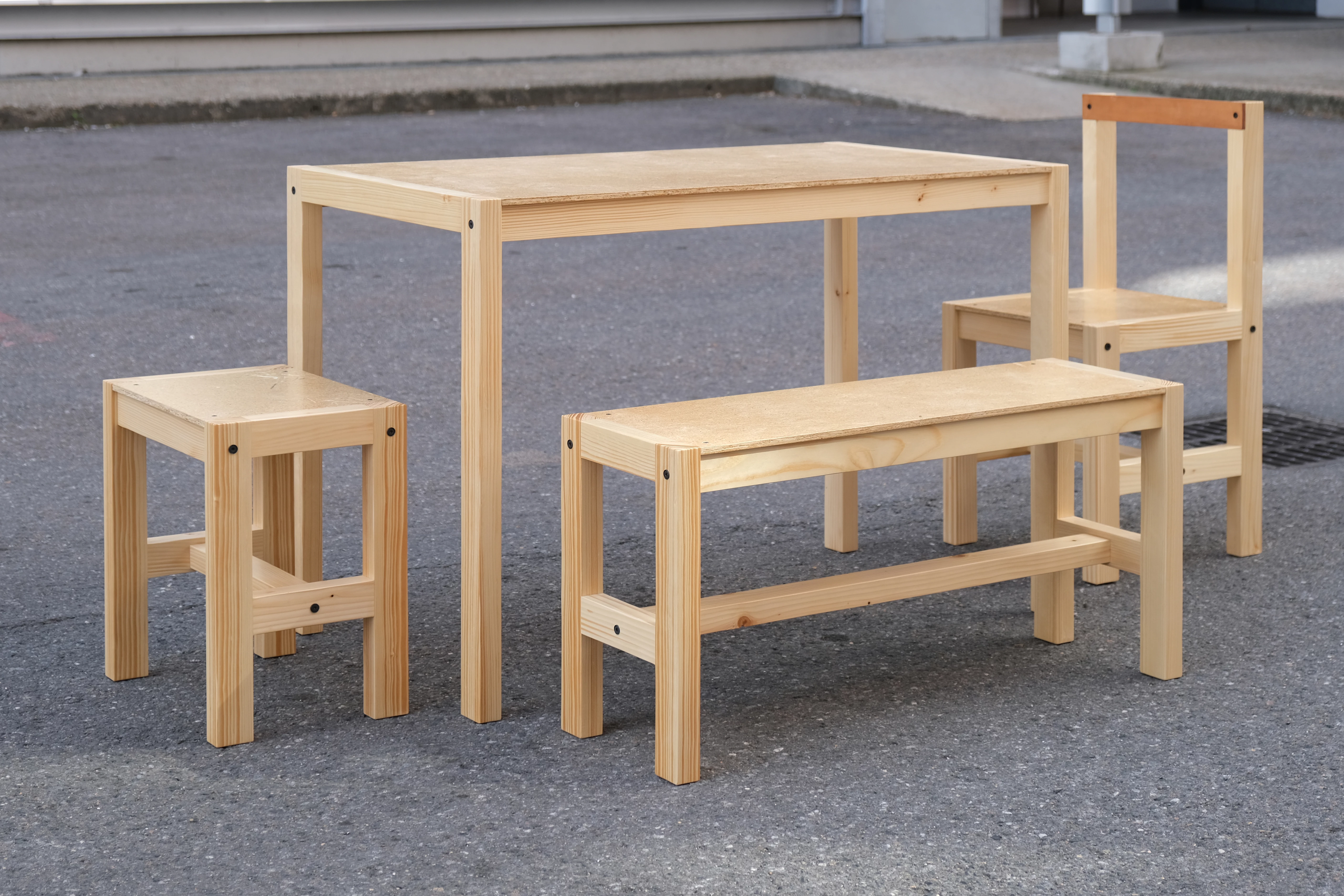 Les meubles PM peuvent être déclinés en changeant l’essence de bois, le type de panneaux, la finition et les dimensions. Le système peut se décliner pour tous types de meubles ; chaise, table, tabouret, banc, étagères …
